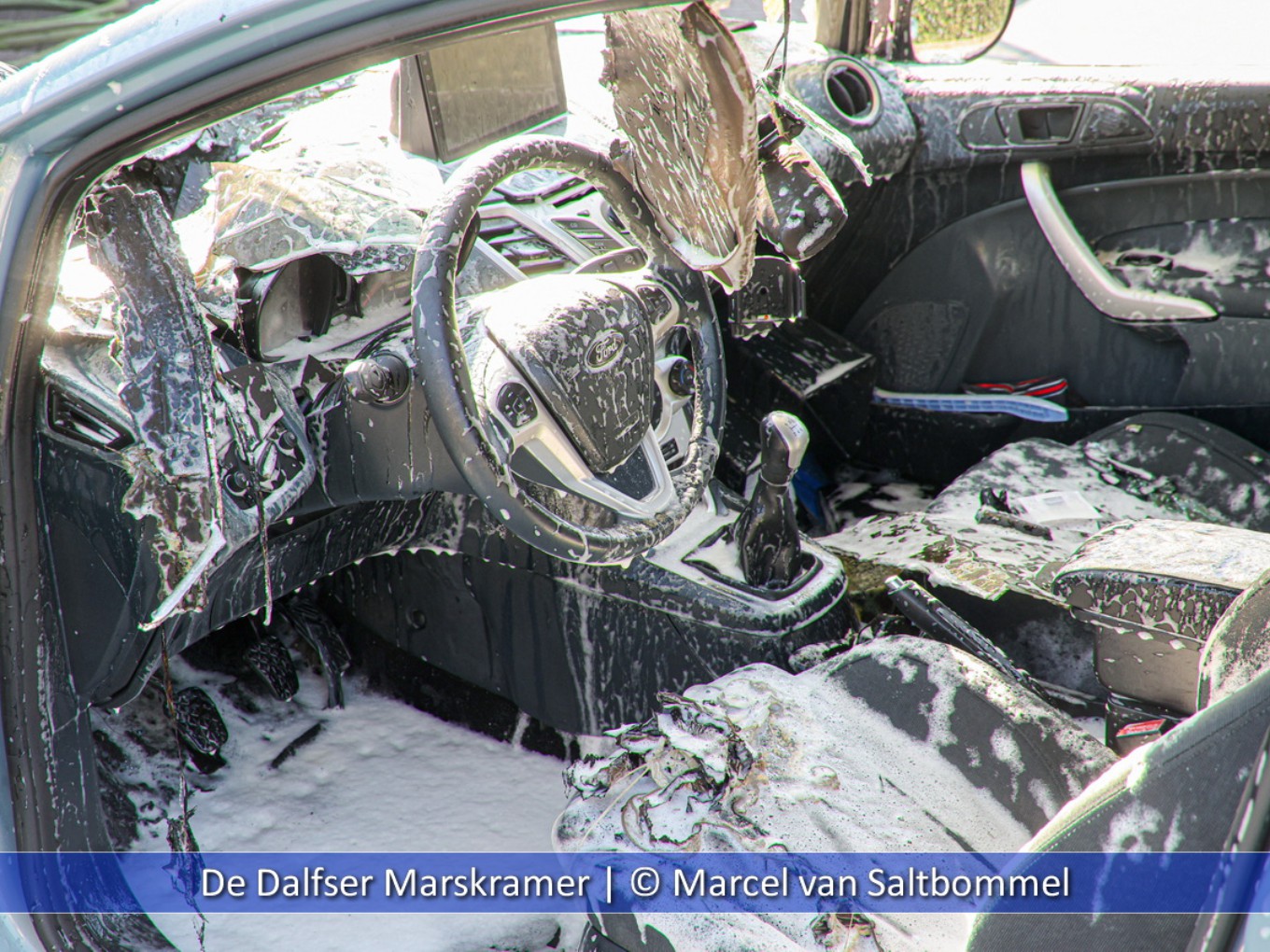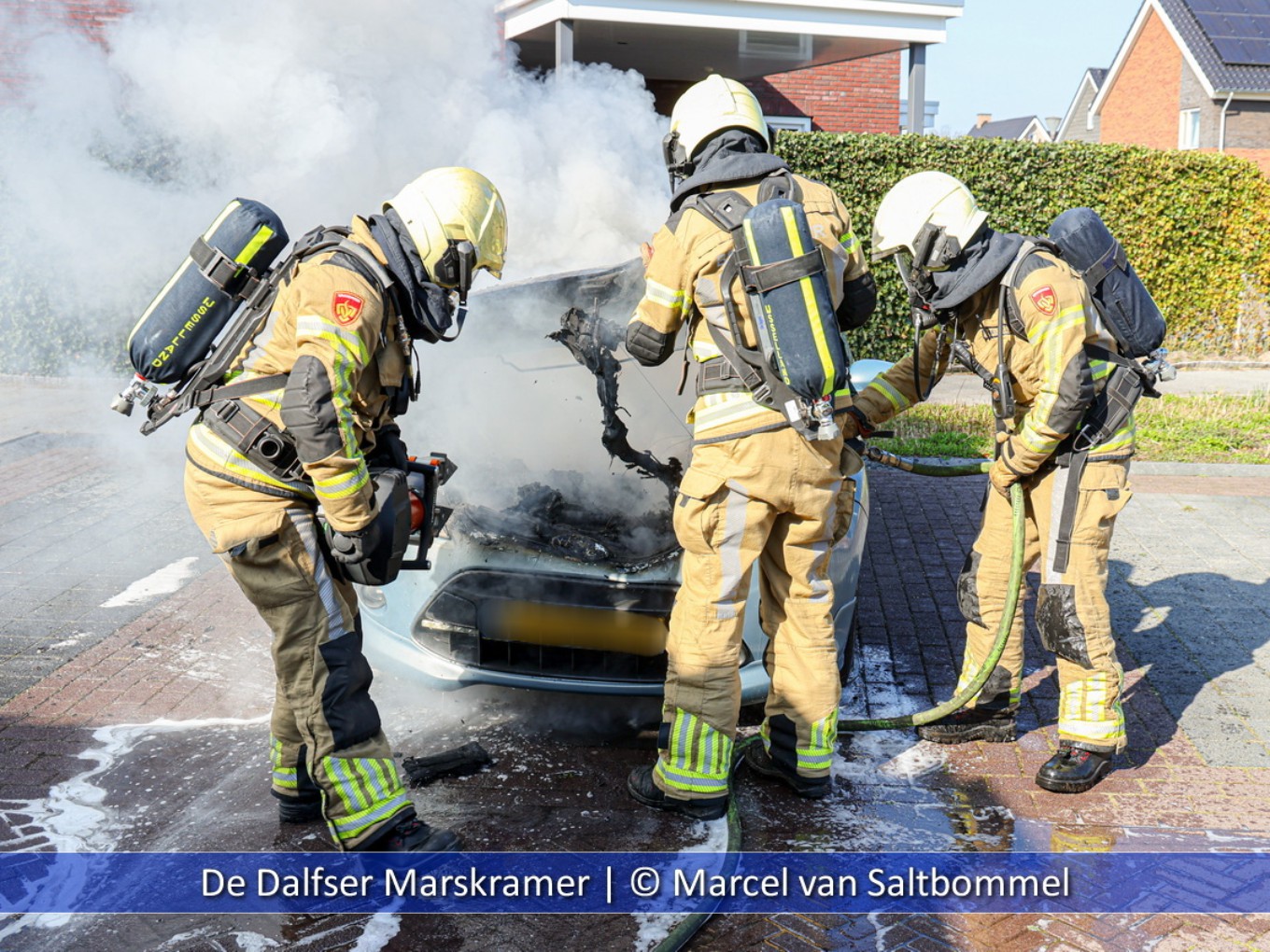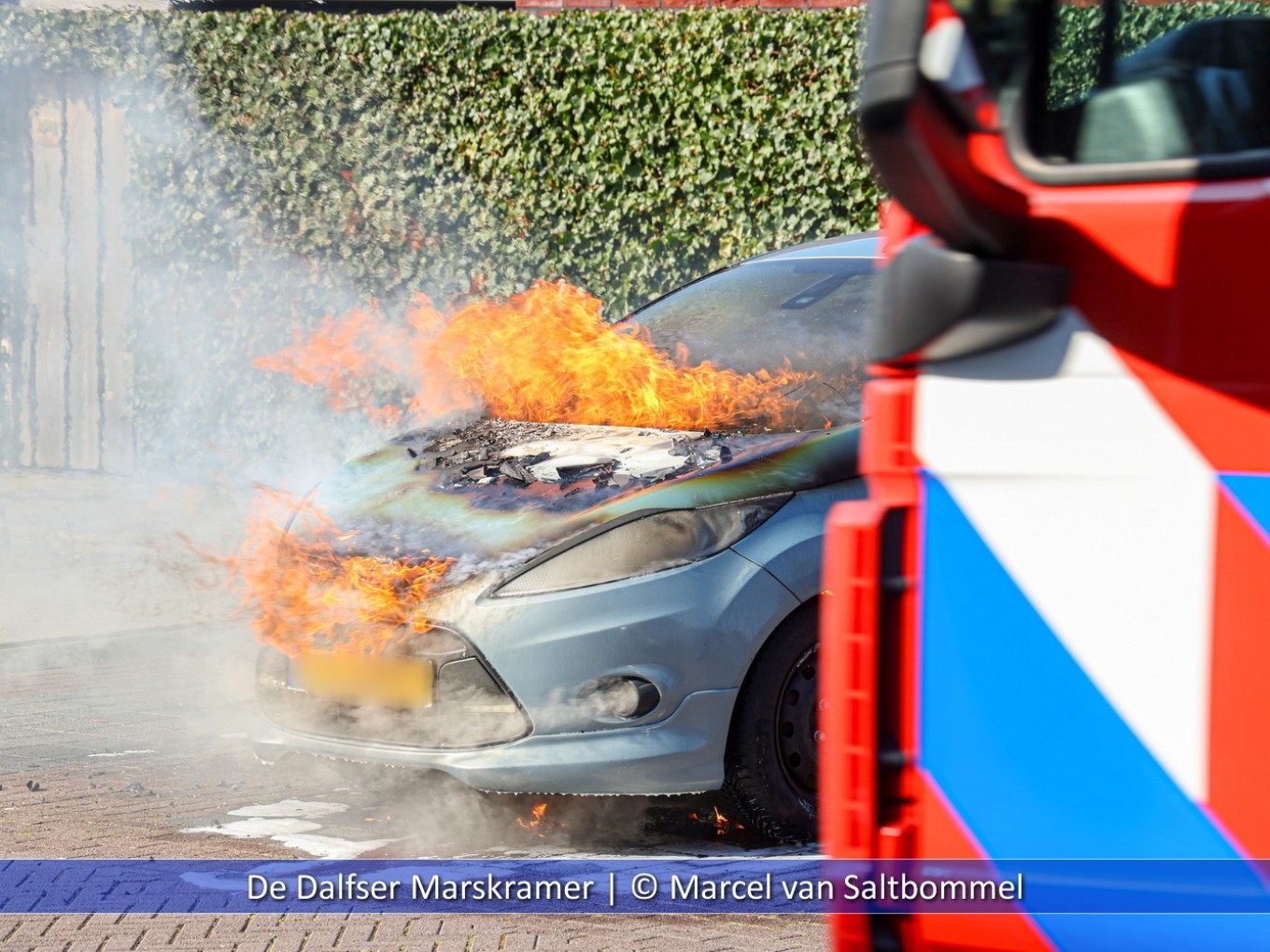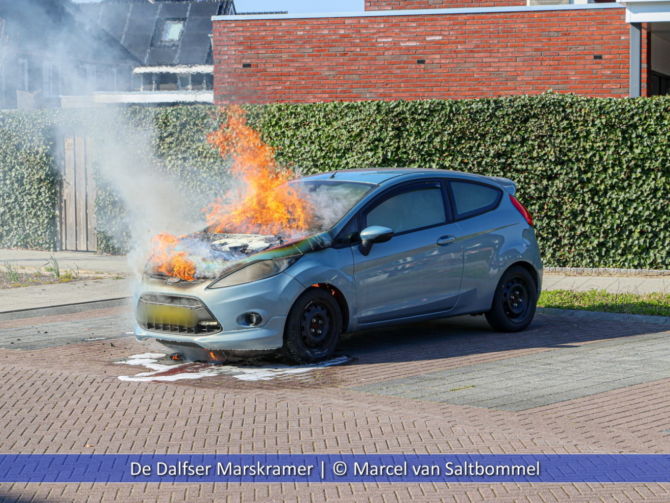 Bij aankomst van de brandweer stond de auto aan de voorzijde volledig in brand. De eigenaar had nog een bluspoging ondernomen maar dat mocht helaas niet baten. Het voertuig was dezelfde dag nog gebruikt voor een rit maar na korte tijd van stilstaan raakte de auto spontaan in brand. Na het blussen kon de brandweer retour en is het voertuig afgesleept.