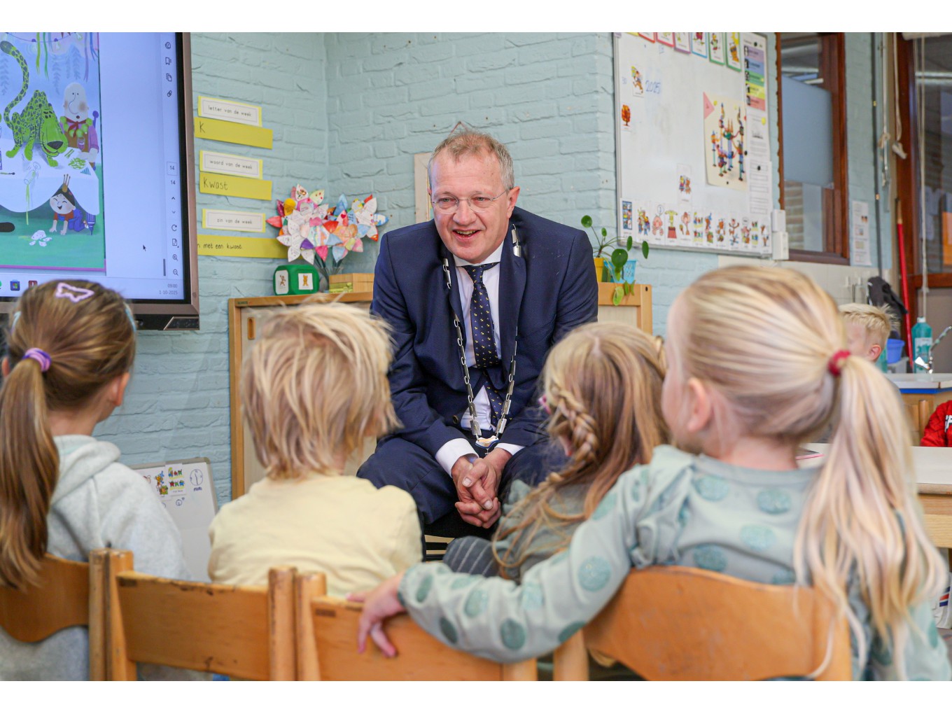 Daarna ging de burgemeester voorlezen bij groep 1-2 en 2-3, uit het spannende boek ‘De koning zonder paard’. Hij zat helemaal in het verhaal, waardoor de kinderen er ook heel erg in mee werden genomen. De leerlingen vonden het boek grappig. Daarna ging de burgemeester nog naar de midden- en bovenbouw voor een gesprekje: de kinderen mochten hem vragen stellen.