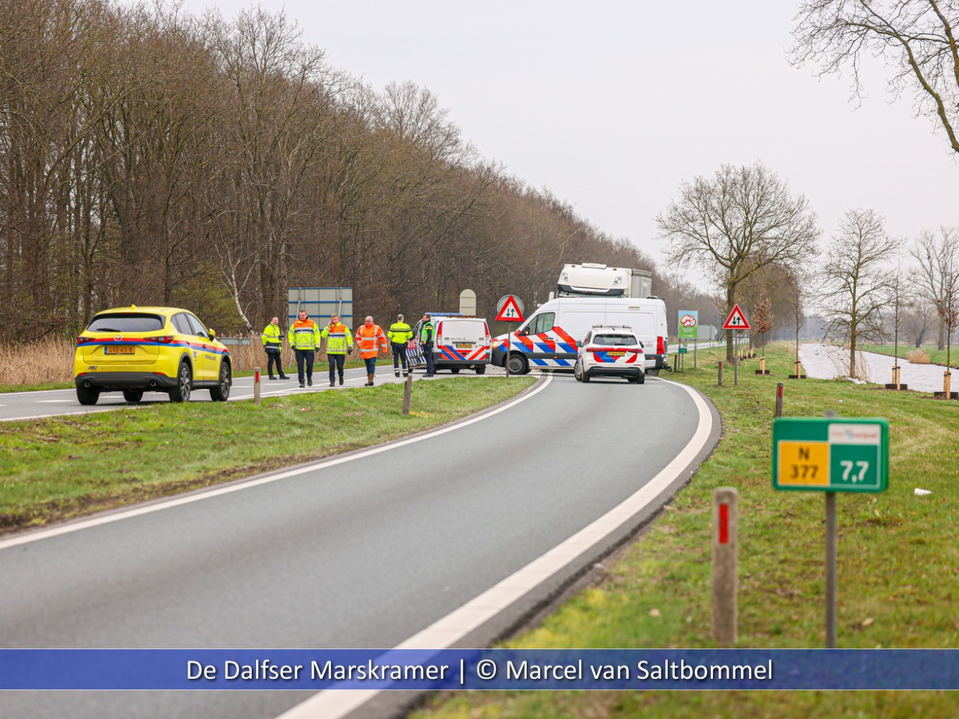 De auto reed in de richting van Nieuwleusen en op het punt dat de rijstroken weer samenkomen kwam de auto in botsing met de vrachtwagencombinatie. Een politie eenheid was op enkele honderden meters vanaf de locatie en werd aangesproken door iemand die het ongeval meldde. De agent was binnen een minuut aanwezig en heeft alle hulpdiensten opgeroepen. Ook een brandweereenheid die toevallig langsreed bood eerste hulp en plaatste een zichtscherm. Ambulances waren ook in rap tempo op locatie maar al snel moest geconstateerd worden dat de automobilist om het leven was gekomen bij de aanrijding. De N377 werd ter hoogte van de Rollecate/Jagtlusterallee in Nieuwleusen afgesloten en bij de Lichtmis. Niet veel later werd ook de afrit Nieuwleusen op de A28 volledig afgesloten. Het onderzoek en berging hebben enkele uren in beslag genomen.