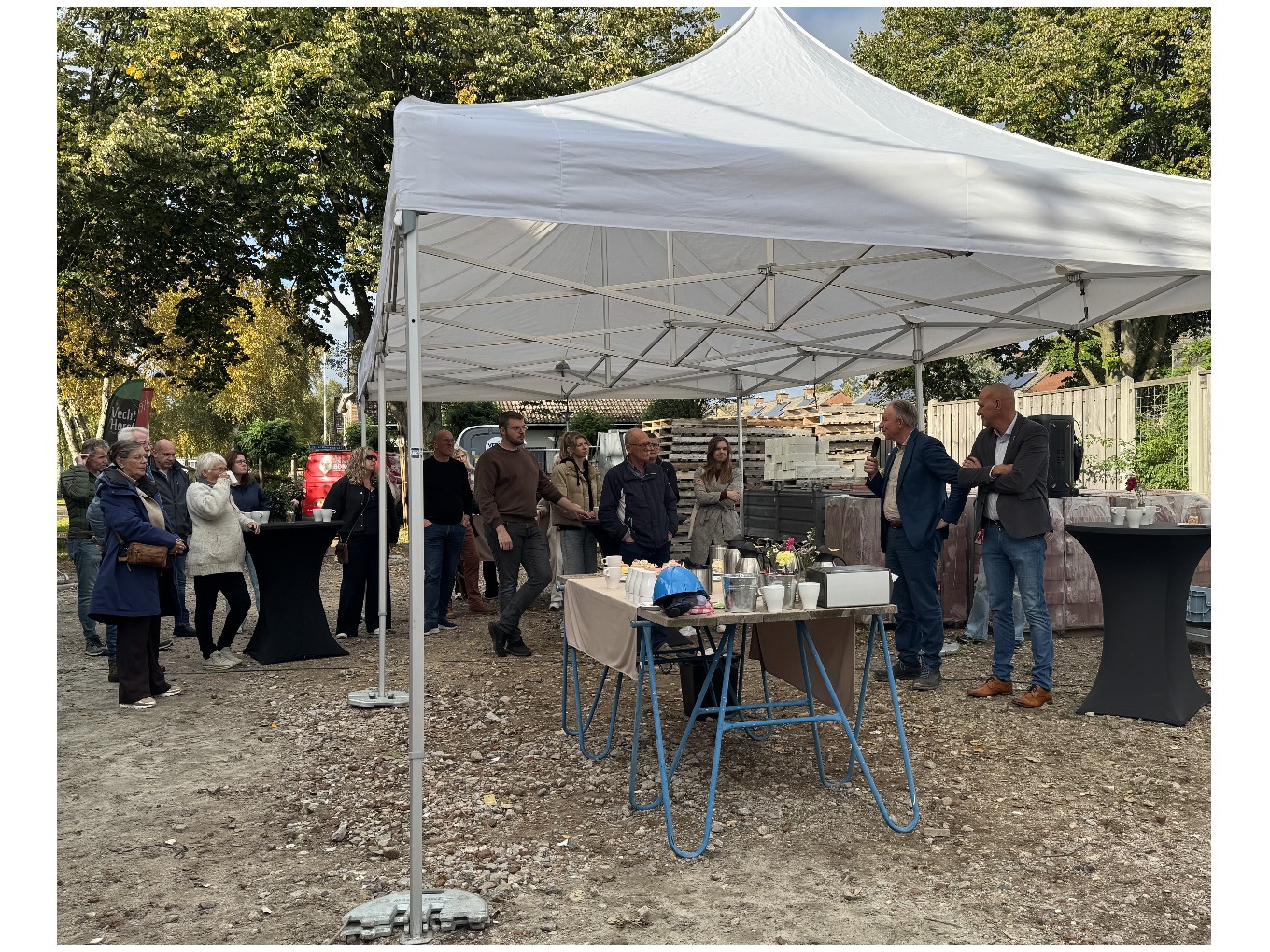 Foto onder: Gerrit Breeman, directeur-bestuurder VechtHorst (links) en André Schuurman, wethouder gemeente Dalfsen (rechts). De toehoorders zijn de toekomstige huurders en omwonenden. Foto: Woonstichting VechtHorst.