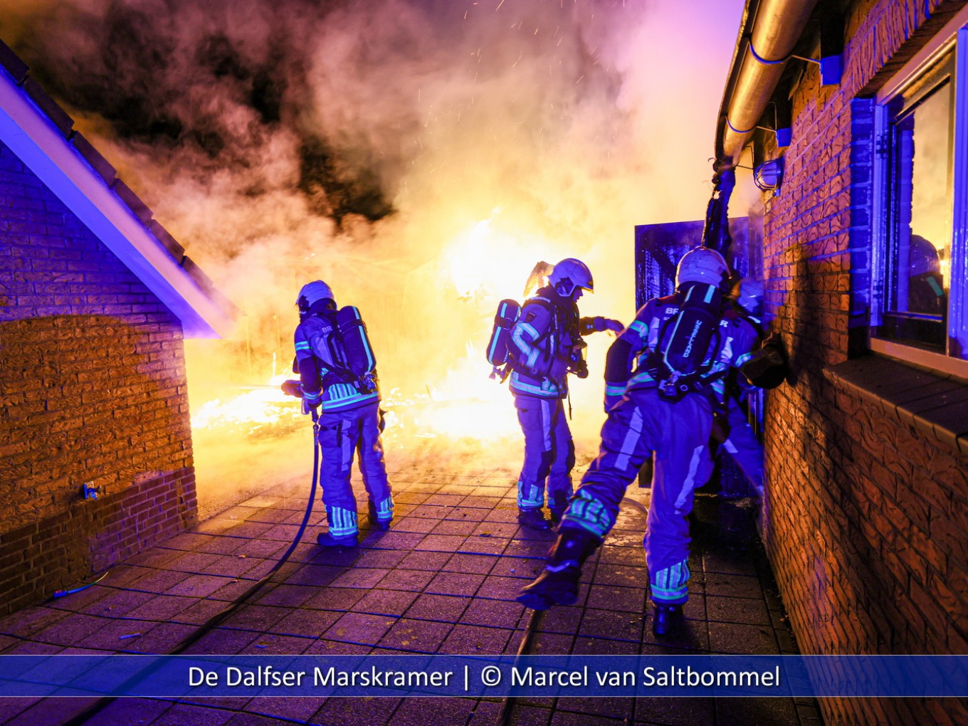 De brandweer heeft op tijd kunnen ingrijpen omdat de hitte de woning en garage al had aangestraald en de grote schuur al bijna begon te branden. De dakgoten en regenpijpen waren door de intense hitte al gesmolten. Na ongeveer een uur kon de brandweer de slangen weer oprollen en inrukken. De brand werd ontdekt door de bewoners zelf.