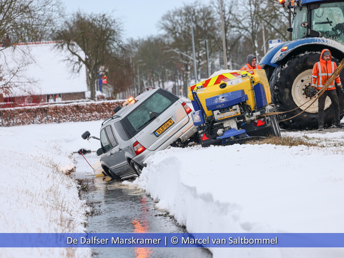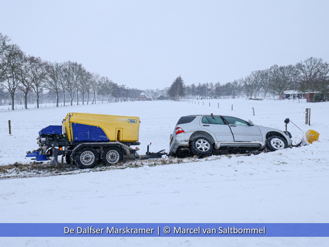 NIEUWLEUSEN - Op het Westeinde in Nieuwleusen is woensdagmiddag een auto met aanhanger van de weg geraakt. De combinatie reed in opdracht van de provincie Overijssel om fietspaden sneeuwvrij te maken en van een laagje zout te voorzien.