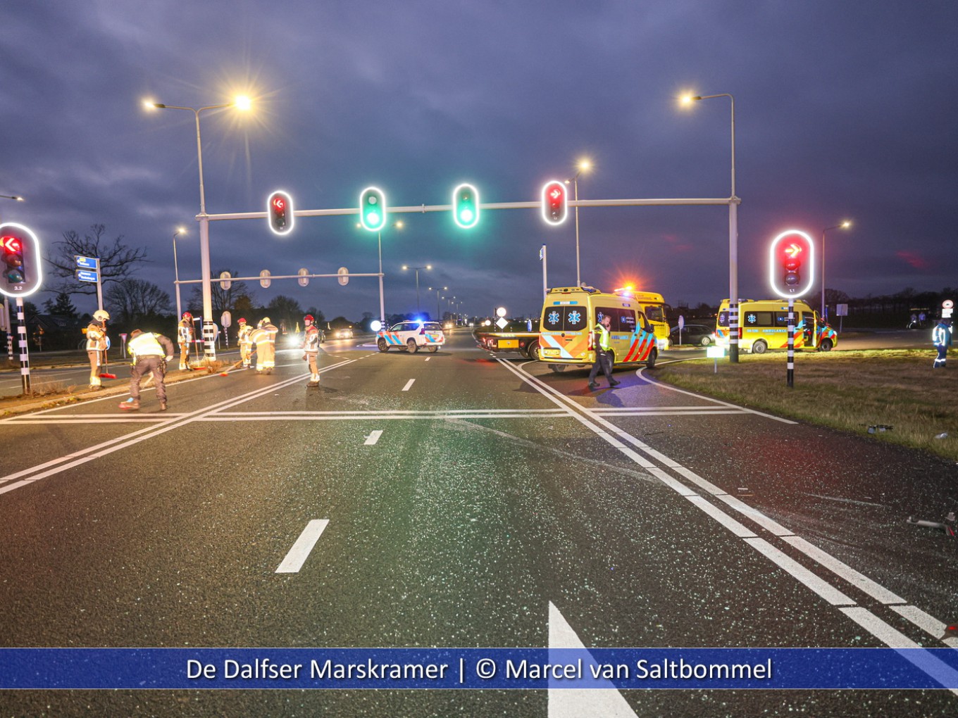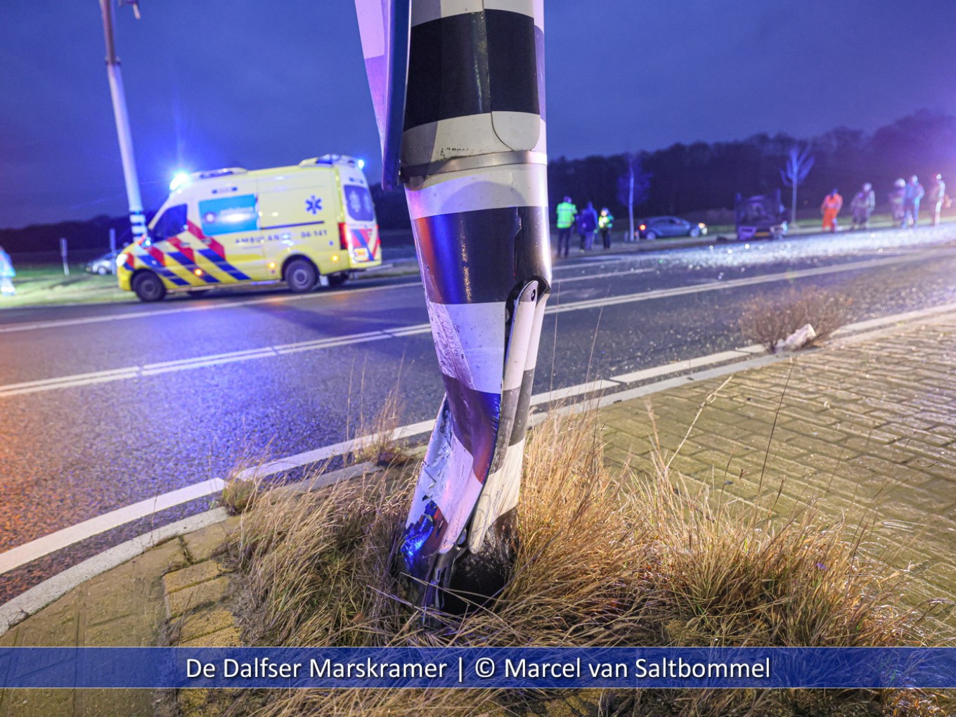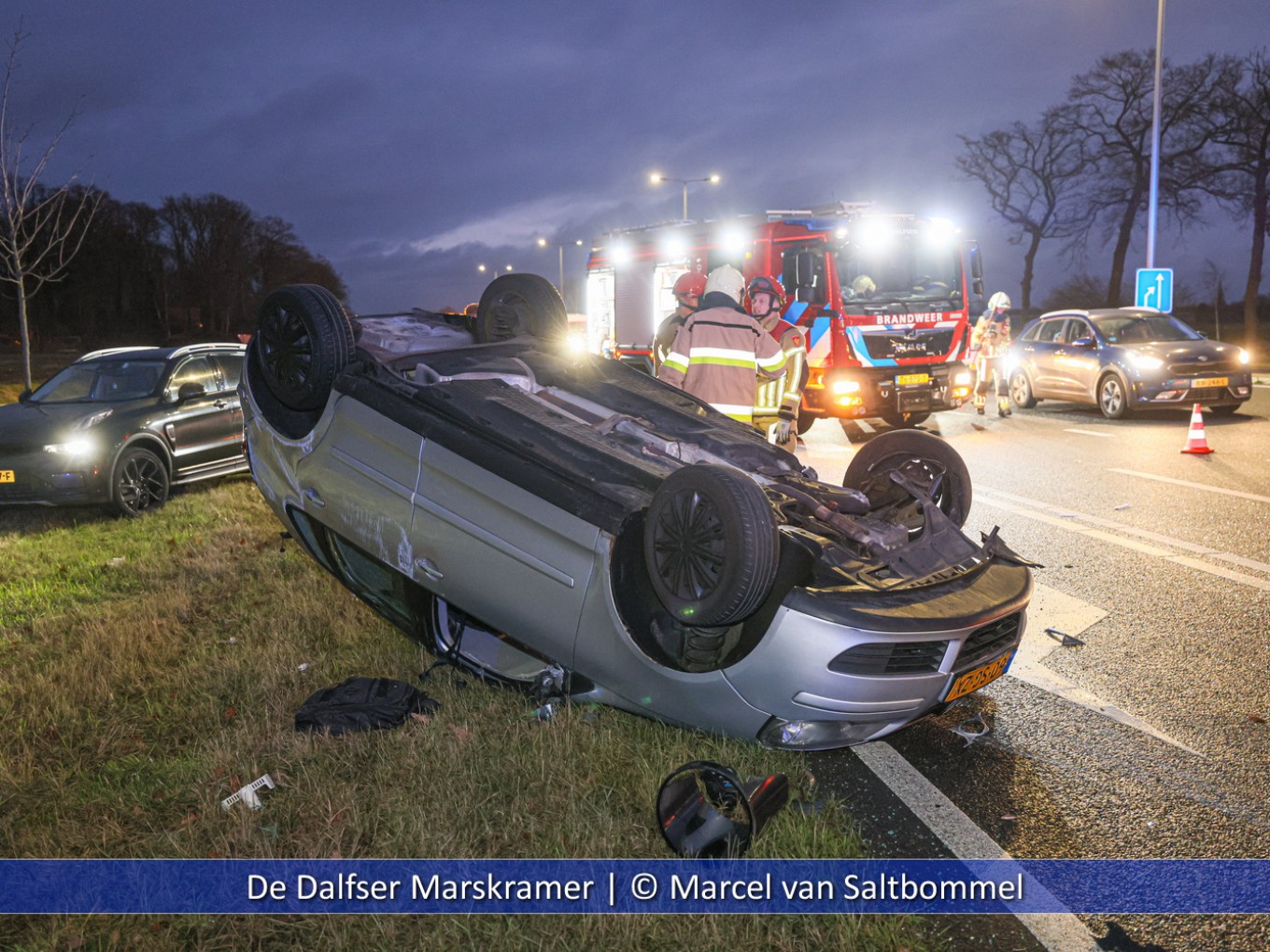 Een personenauto die uit de richting van Zwolle kwam is tegen een paal van de verkeerslichtinstallatie gereden en daarna over de kop geslagen. Uit het voertuig stroomde benzine wat een gevaar kon opleveren. De inzittende kon tijdig uit het voertuig komen en is in de ambulance opgevangen. Andere weggebruikers waren gestopt om hulp te verlenen. Vermoedelijk is er iets misgegaan bij het inhalen/invoegen ter hoogte van de stoplichten. Brandweer Dalfsen heeft de brandstoflekkage verholpen en het wegdek schoongemaakt van een grote hoeveelheid glas zodat het verkeer weer verder kon rijden.