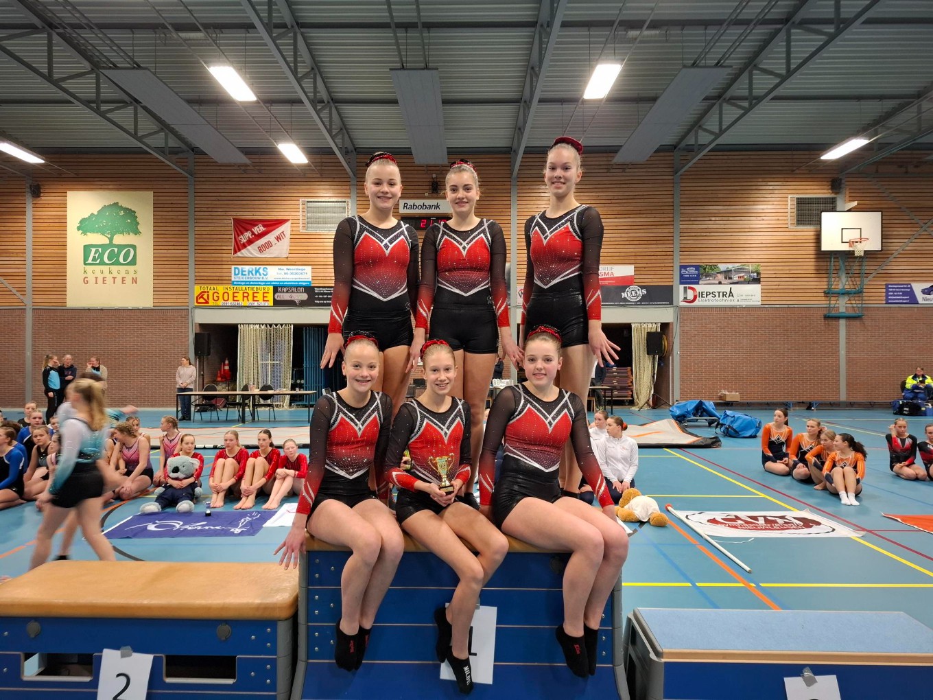 In het tweede blok sprong het seniorenteam met Sophie, Sophie, Lotte, Lotte Noah en Eva op het B niveau. Zij werden met ruim tien punten eerste en namen de gouden beker in ontvangst.
